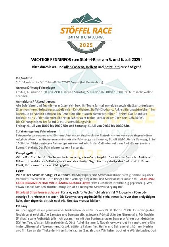 In etwas mehr als vier Wochen ist es soweit, dann ist Anreise zum Stöffel-Race 2025. Das Orgateam des Stöffel-Race ist bereit, wir freuen uns auf die ganze Bande an Stöffel-Racern, freuen uns darauf, Euch wiederzusehen, oder, je nach dem kennenzulernen.